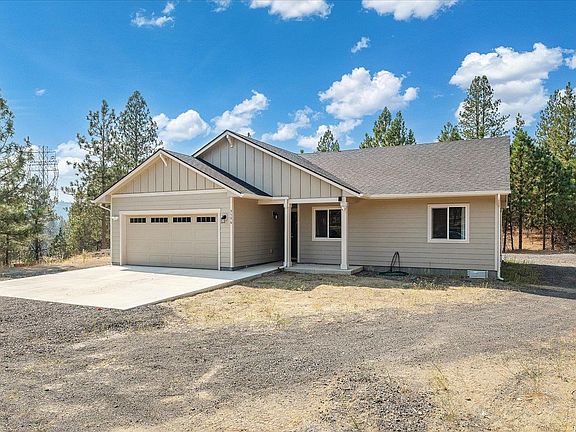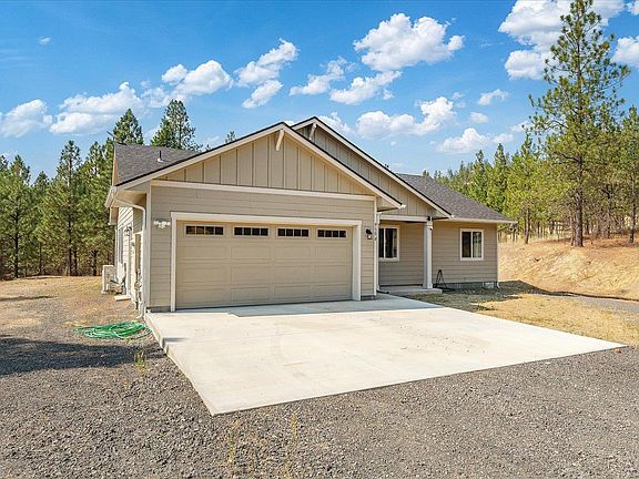 Located in the highly sought after Nine Mile Falls, this 2022 single level home offers peace, space, and convenience. With 3 bedrooms, 2 bathrooms, and over 1,300 sq ft, the thoughtful layout includes a primary master with en suite bath. A brand new concrete patio extends your living space outdoors, ideal for quiet evenings or gathering with friends. The property is set well back from the main road, where deer and other wildlife frequently roam, creating a quiet retreat. Zoned Rural Conservation, the land ensures low density and lasting tranquility. Riverside State Park is just minutes away, offering over 9,000 acres of trails, camping, fishing, rafting, and more. Despite the setting, you are only 10 minutes to the VA and Spokane International Airport and 15 minutes to Fairchild AFB, making this home the perfect balance of rural seclusion and city convenience.