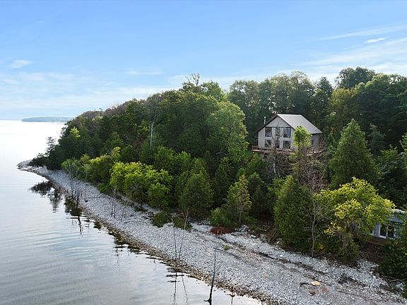 Private waterfront home with 210' of Door County shore. Enjoy the bay year round in this beautiful open concept home with soaring wood ceilings. Plenty of light through the skylights and all the windows facing the bay so you can take in the views of the bay and natural surroundings. The main level has beautiful wood floors with beams recycled from a warehouse in Chicago and Sturgeon Bay shipyard. Wormy maple wood cabinets built by a local artist. The 23 x 15 Studio at the waters edge is perfect for your art studio or lounging! Year round fun with swimming and boating and fishing in summer and winter ice fishing, snow shoeing and cross country skiing! Come and enjoy the quiet side of Door County!