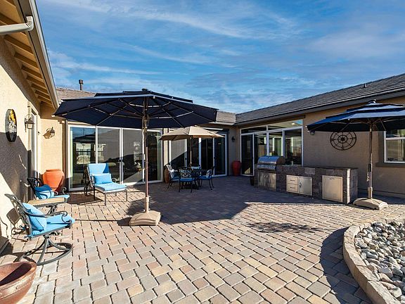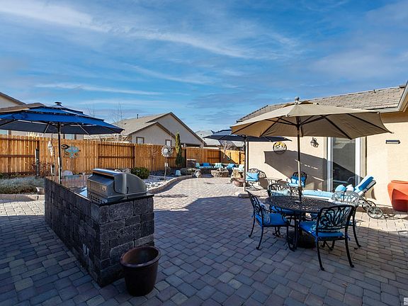 Nestled in the exclusive 55+ community of Regency Presidio at Damonte, this exquisite residence offers a perfect blend of luxury and tranquility. Boasting 3 bedrooms and 3 1/2 baths, the home features an additional bonus enclosed breezeway, providing versatility and convenience. Step into a meticulously upgraded interior with modern finishes and open living space. Outside, discover a haven for relaxation or entertaining with a sprawling paver patio, built-in BBQ, gas fire pit, and extensive seating, The outdoor space is ideal for entertaining under the Nevada skies. The enclosed breezeway adds and additional 210 sq ft of living space with added heat, A/C and a slider to the back patio. This home epitomizes comfort and sophistication, presenting an unparalleled opportunity for 55+ buyers in a premier community. Residents can enjoy the Regency Lifestyle with 24/7 manned security gate, a 17,000+ square foot Clubhouse with indoor swimming pool, spa, billiards room, meeting rooms, fitness center, a wide variety of clubs and activities to participate in.