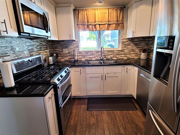 Kitchen: The newly upgraded kitchen is a chef's delight, featuring stainless steel appliances, elegant white cabinets, granite countertops, a new sink, wide plank flooring, and new windows. Enjoy a beautiful view of lush grass and trees while preparing meals.
