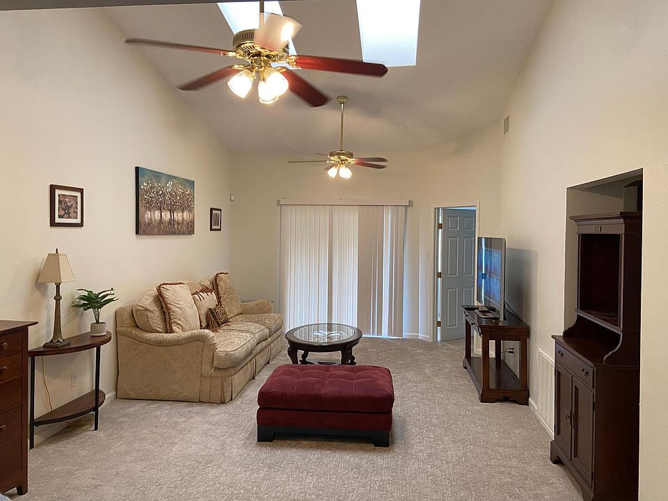 Freshly painted and newly carpeted 2 bedroom and 2 bathroom condo in convenient location. Close to schools, library, shopping and bus line. This is a beautiful second floor unit with vaulted ceilings and 2 skylights in main living area. Main living area and bedrooms have ceiling fans with new energy efficient LED bulbs. Eat-in kitchen includes dishwasher, new stove/oven, refrigerator/freezer with ice maker and pantry. Master bedroom has walk-in closet and French doors that lead out to cute balcony. Master bath includes walk in shower. Guest bath has soaking tub. Unit also includes new stackable washer/dryer. Reserved parking space for unit with plenty of guest parking available. Unit will be shown by appointment only. Tenant responsible for electricity, cable/internet, and $50 credit check per applicant. No smoking or pets allowed. Tenant must abide by all Avant Garde Homeowner's Association rules and regulations. Amenities include 2 pools, tennis court and party room.
