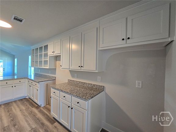 Tile flooringCustom white cabinetsGranite kitchen countertopsWalk in tile showerCarpet in all bedrooms