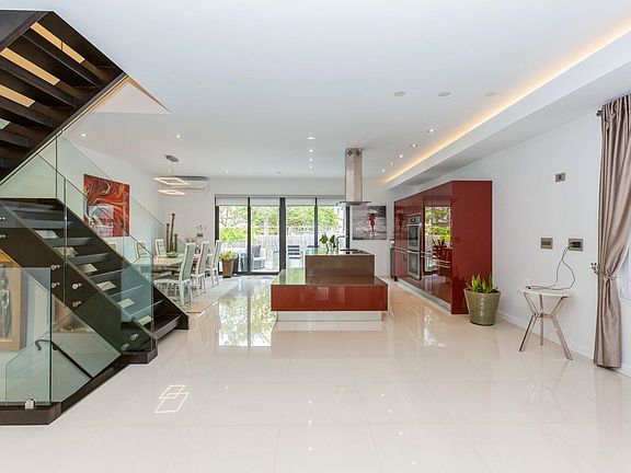 Welcome to this beautifully semi-furnished 3BD/3.5BA home with PRIVATE POOL offering three levels of refined living space with high-end finishes throughout, nestled in one of Weehawken's most desirable neighborhoods, just ten minutes from New York City. The open-concept layout features sleek porcelain tile floors and a designer kitchen equipped with Miele concealed appliances, a spacious center island with seating ideal for entertaining, and a striking contemporary staircase encased in glass railings connecting all three levels. Floor-to-ceiling glass sliding doors lead to an expansive deck with a retractable awning overlooking an inviting in-ground pool. Upstairs, the second floor offers three bedrooms, a common bathroom and a laundry room. The primary bedroom boasts a luxurious retreat complete with a spacious bathroom featuring a shower and double vanity, a generous walk-in closet, and direct access to a large private balcony for those morning coffees. The fully finished basement provides a cozy retreat with a wet bar, media room featuring a home theater projection system, recreation and exercise rooms, a full bath, a utility room and generous storage. Additional highlights include radiant heating, LED lighting, Nest thermostats, security cameras, a video intercom, heated towel racks, brand new split AC units on the main floor and automated blinds. A bus stop with buses to NYC is just two blocks away, and an assigned parking space is included (at additional cost of $150/month) in a gated lot across the street. This exceptional home is truly a must-see.