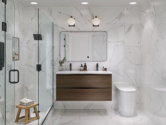 The bathroom in Garden Residence L evokes a spa-like retreat, complete with a Woodbridge toilet, double vanity sinks, and an enclosed glass stall shower, providing an elegant sanctuary for relaxation. For added convenience, a stackable Electrolux washer and dryer are included within the unit, making laundry day effortless. Central air conditioning ensures year-round comfort, while ample storage space, including a large private storage room, meets all your organizational needs.