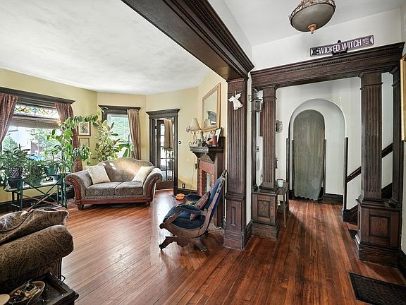 Let the charm of a Cozy Corner antique colonial inspire you with its beautiful front porch worthy of fall evening gatherings. The old character of craftsman created woodwork details are still here. A beautiful living room with corner fireplace welcomes you while a parlor offers a great home workspace. Formal dining room with a built-in hutch, transom window and chair rail offers a great space for entertaining. Pantry space with plenty of storage also contains laundry facilities. Bright sunny kitchen has farmer sink, pretty backsplash, gas stove and plenty of space to create the perfect meal. Upstairs there are three nice sized bedrooms, one being used as den. A dressing room has closet storage, a shower and extra sink. The main bath has a great deep tub and original sink. The third floor has 2 large rooms with closets and a nice storage closet. Out back is a nice, fenced area with garden area and cement patio. Old style garage (as is) for storage.