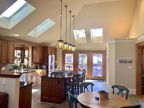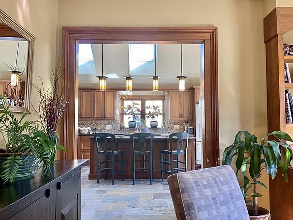 - Kit Dscrp: Dining Area, Countertops - Stone/Granite/Solid, Skylight, Ceiling - Cathedral, Flooring - Stone/Ceramic Tile, Kitchen Island, Stainless Steel Appliances, French Doors, Open Floor Plan, Window(s) - Bay/Bow/Box, Wine Chiller, Crown Molding