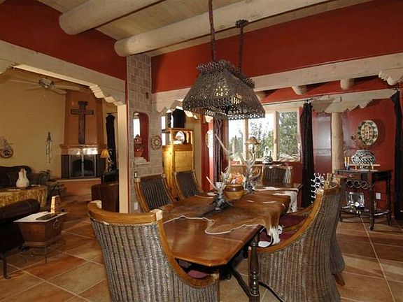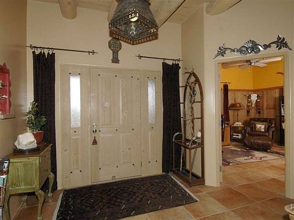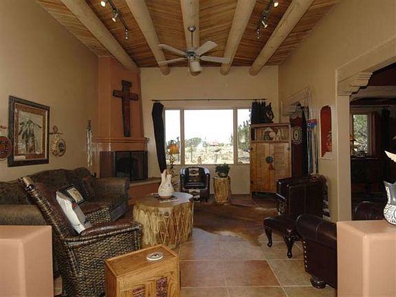 Custom built 3 bedroom, 2 bath home by Tierra de Zia Construction. Features include vigas, Italian tile flooring, granite tile counters, rustic maple cabinetry, wine cooler, large formal dining room, large walk-in shower, talavera sinks, custom framed mirrors, larger master bedroom, custom doors and hardware and a large fenced RV space with hookups. Outdoors includes large front and rear portal, landscaping with drip irrigation an beautiful Sangre de Cristo views.