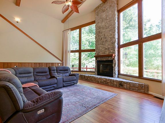 Pride of ownership abounds within this well-maintained home, just a minute's golf cart ride away from the beautiful banks of Table Rock Lake. This alluring chalet boasts vaulted ceilings in the large and inviting living room where the focal point is the view of Ozarks seclusion, separated only by the beautiful stone fireplace w/ blower. Recently updated kitchen and expansive dining areas open to the living room make this oasis perfect for entertaining guests or enjoying the sunrise in solitude. SINGLE-LEVEL living: Main floor of the home features massive Homeowner's Suite complete with en-suite bath and ENORMOUS walk-in closet, large second bedroom, kitchen, dining & living rooms, laundry/mudroom, and attached three-car garage. Third loft bedroom is complete with full bath and nicely-sized walk-in closet. John Deere room located on the lower level in the back also grants interior access to crawlspace. 10 x 20 storage shed included and painted to match the house making the aesthetic of this ideal property one to see! Reasonably priced furniture package available! The lakefront subdivision of Walnut Springs proudly welcomes you as you drive thru the stone entry and discover a park-like setting complete with children's play area, gated boat/RV storage, boat launch and fishing/swimming dock specifically for use by homeowners. Welcome home to 96 Jeffery Lane...
