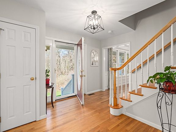 Open House Sun 4/27 from 12-2. Neo-Colonial w/ Extensive Upgrades. Nestled on nearly 2 secluded acres abutting conservation land, this 4 bed 2.5 bath home boasts a wealth of recent improvements & features. Enjoy a well-appointed kitchen w/granite counters, an adjacent casual dining area, & direct access to serene screened porch. Step outside to expansive deck, perfect for entertaining. Main level also features stunning cathedral-ceiling great room, w/massive cast stone gas fireplace. A formal dining room, includes a 2nd fireplace & a home office w/French doors for a quiet space. Upstairs, the Master suite boasts cathedral ceilings, a walk-in closet, & ensuite bath. Three additional generously sized bedrooms, 2nd full bath, & convenient laundry area complete the 2nd floor. Significant recent upgrades include the elimination of oil heat in favor of a state-of-the-art rooftop solar array & heat pump system, ensuring you Near-Zero energy consumption savings for years to come.