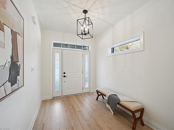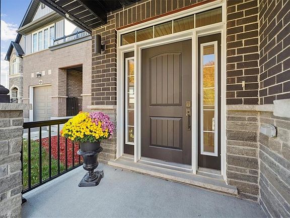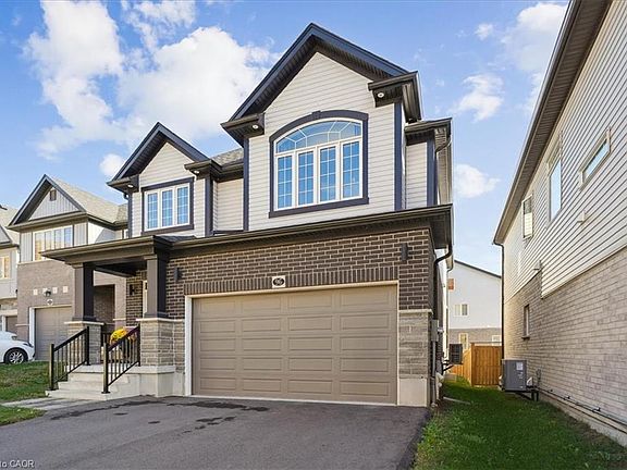 Discover your dream home in the heart of Kitchener's new, family-friendly Trussler West community. Nestled on a quiet street, this exquisite 2,382 sq.ft. residence blends tasteful modern finishes with timeless craftsmanship, creating a truly magnificent living space. From the moment you arrive, the home impresses with its classic brick facade and a double-car garage offering parking for four vehicles. Step into a bright, open-concept main level where 9-foot ceilings & continuous engineered hardwood floors establish a modern, airy atmosphere right from the foyer. The living and dining areas, illuminated by pot lights and chandeliers, create the perfect ambiance for both entertaining guests and quiet family evenings. The heart of the home is the stunning modern kitchen, a chef's delight featuring a large quartz centre island,custom backsplash,extended cabinetry, and stainless steel appliances. From here, slide open the doors to a walk-out deck. A main-floor office provides a quiet space for work or study. Upstairs, the primary bedroom serves as a personal sanctuary,a large walk-in closet, and a luxurious ensuite. Unwind in the elegant soaker tub or the spacious glass shower, and appreciate the privacy of a separate water closet and the convenience of double sinks. Three additional generous bedrooms share a well-appointed 5-piece main bath, thoughtfully designed with a water closet and double sinks to streamline morning routines. The home's potential continues with a large, unfinished basement-a blank canvas awaiting your personal touch. This Net Zero home is future-ready, with rough-ins for solar panels, an electric vehicle charger, and a basement bathroom and bar. Enjoy the perfect balance of tranquil nature, with the trails of Trussler Woods nearby, and commuter convenience, with easy access to Highways 7/8 & the 401. You're also just minutes from major shopping hubs like the Sunrise Shopping Centre. This is more than a house-it's the home you've been waiting for.