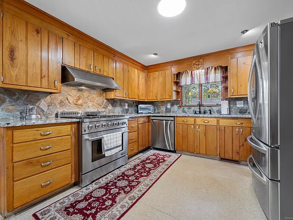 Beautifully set on private spacious lot overlooking babbling brook with views across the entire rear of this impress Sprawling Ranch Home from both levels, main and the walk out finished lower level both on grade. Impressive and functional 3 fireplaces with gas log sets and remote controls for ambiance, warmth and beauty. Gleeming hardwood floors throughout, Stone walls and granite kitchen features one of the fireplaces a newer 6 burner stove/oven any gourmet will love along with newer dishwasher and refrigerator spacious enough for table for 12 ! Side foyer entry has laundry room and separate half bath.