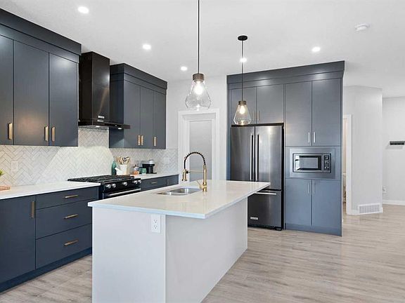 Welcome to this beautifully finished and thoughtfully upgraded Calbridge-built home backing onto a pathway and offering a blend of style, comfort, and functional living across all three levels. From the triple-pane windows to the fully developed sunshine basement, every detail has been selected to enhance everyday life. The main floor features a spacious front entry, 9 ft ceilings, fresh paint, a convenient 2pc bath, and an open-concept layout that is ideal for both family living and entertaining. The kitchen stands out with full-height dark grey/blue cabinetry, quartz countertops, herringbone tile backsplash, a large island, and KitchenAid dark stainless steel appliances including a gas range, and built-in microwave. The walk-in pantry provides exceptional storage with tons of shelving. The bright living room offers a gas fireplace with conduit to keep media wiring hidden and large windows that capture serene views of the backyard and pathway. The dining area comfortably fits a full-size table and leads to the back deck with BBQ gas line, stairs down to an exposed concrete patio, fresh mulch landscaping, storage under the deck, and a built-in cast iron firepit, perfect for relaxing or hosting. Upstairs, brand new carpet leads to a central bonus room with tray ceiling and pot lights. The primary suite feels like a retreat with vaulted ceilings, gimbal potlights, a feature wall, a large walk-in closet, and a 5pc ensuite including comfort-height double vanity with quartz counters, a soaker tub, and a tiled shower with niche. Two secondary bedrooms (one with a walk-in closet), a full 4pc bathroom with quartz countertops, and an upper laundry room with folding shelf complete this level. The fully finished sunshine basement is warm and inviting thanks to double-insulated walls and a dual-zone furnace, and includes a spacious recreation room, large bedroom with walk-in closet, 4pc bath with quartz counters, storage space, sump pump, and rough-in for radon. The double attached garage is plumbed and ready for utility use, making it ideal for future workshop needs. This is a move-in ready home where thoughtful upgrades, practical design, and location come together, set in a quiet, family-friendly area with direct pathway access right out your back door.