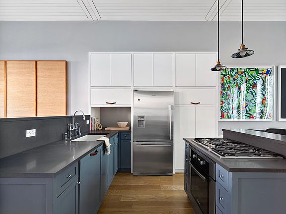 Not your average condo duplex! This boutique townhouse condo feels more like a loft with 12 foot ceilings and sophisticated design throughout. Apartment 1 offers an open-plan living, dining, kitchen space with three windows across the front and back, three bedrooms, two full baths plus a sweet private patio. The large, U-shaped kitchen features custom shaker-style cabinetry with chic leather pulls and Pacific grey limestone counters, Bosch range and dishwasher, Fisher Paykel fridge and smart storage for kitchen appliances. A beautiful custom bookshelf separates the kitchen and dining space.