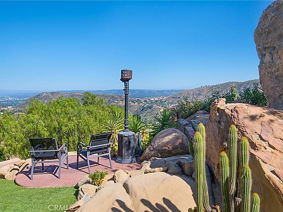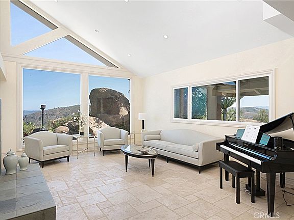 This stunning 4-bedroom estate nestled in the gated community of Bell Canyon offers unparalleled views of the canyon, boulders, and cityscape. Stepping into the grand living and dining areas, you're greeted by soaring cathedral wood ceilings and a striking double-sided slate fireplace. Floor-to-ceiling windows seamlessly merge indoor and outdoor living, bathing the space in natural light. Travertine floors grace the living spaces, including the expansive gourmet kitchen featuring Viking appliances, granite countertops, custom cabinets, and a cozy fireplace-adorned breakfast nook. Flowing from the kitchen, the family room boasts a majestic marble and granite fireplace with a raised hearth, perfect for cozy gatherings. Ascend the spiral staircase to discover a private office space with cathedral wood ceilings, offering a serene retreat. The luxurious primary suite beckons with its own fireplace, dressing area, colossal custom closet, and a soothing sauna. The ensuite bathroom is a sanctuary, featuring double vanities with marble counters, a clawfoot tub, and a rejuvenating steam shower. On the lower level, a guest bedroom with an ensuite bathroom provides convenient access from the driveway. Walls of glass lead to a covered tiled patio and meticulously landscaped grounds, complete with a charming rose garden, BBQ dining area, and natural boulder landscape. There is a half basketball court and ample parking space complemented by an oversized three-car garage with a spacious storage room. Witness breathtaking sunrises and sunsets framed by the majestic boulders, making this property a true gem. Bell Canyon offers residents exclusive amenities, including a fitness center, tennis courts, parks, and an Equestrian Center, along with scenic riding and hiking trails. The community thrives on a strong sense of camaraderie, hosting various annual events such as Halloween parties, Egg Hunts, Summer BBQs, Food Truck Rallies, and New Year's Eve celebrations. Plus, enjoy the esteemed Las Virgenes Schools district.