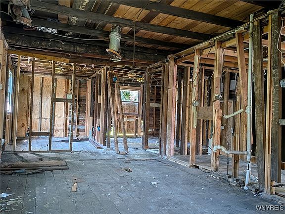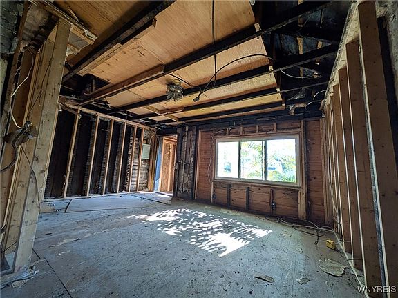 Property was fully gutted (permitted) in preparation for renovations and includes a newer furnace and duct distribution. Initial concept was for 2 bedroom 1 bath house, with vaulted ceiling kitchen/living room. Features large shed and secluded backyard. Potential to coordinate with neighbor for shared driveway (with rear parking), but ample street parking readily available.