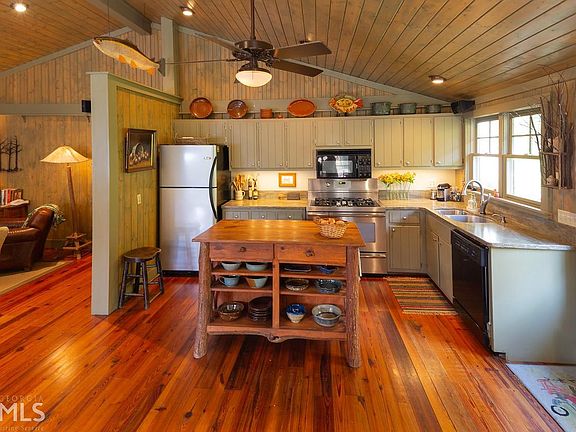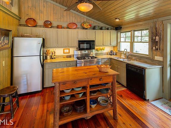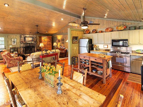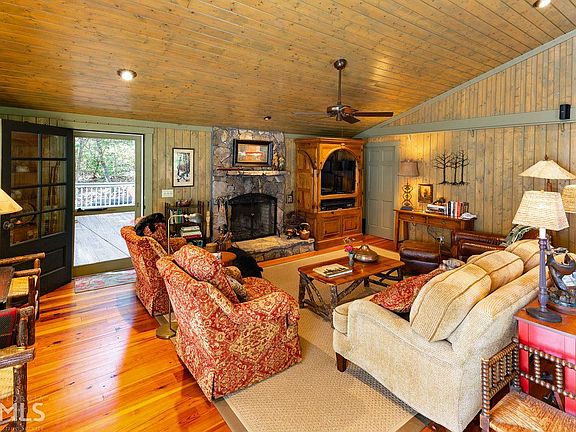 Charming 4BD/4b cottage on 1.5 private ac. near Anchorage Marina. Great room features heart pine flooring, wood paneled walls and ceilings and masonry stone fireplace. Open floor plan includes dining for 8+ and well-equipped kitchen. Enjoy views of glassy mountain from the spacious screened porch or side deck with outdoor fireplace. Features include private main floor master suite plus 2 guest bedrooms on main, lower level rec/bunk room, 1-car garage for golf cart, dog run, storage shed and play house. New HVAC installed in 2018. 1 min. drive to Anchorage, 4 min. drive to Waterfall Club, 10 min. drive to Downtown Clayton. Golf cart included. Transferable concierge boat storage at Anchorage Marina makes this property feel just like lake access.