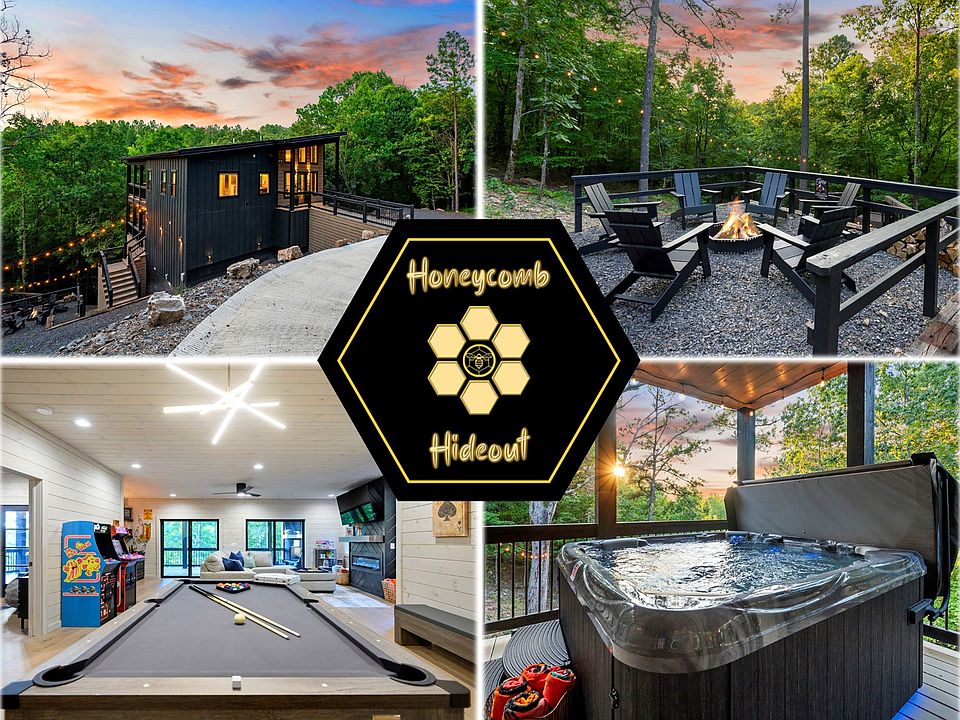 The Honeycomb Hideout is an incredible 2 bedroom mountain cabin in Broken Bow, OK, offering long range views, privacy and a ton of amenities for an amazing vacation. Tucked on the side of mountain and surrounded by the beautiful pine timber of Hochatown, this modern cabin features soaring ceilings, expansive windows, and an open-concept living area that invites entertaining. With 2 luxuriously furnished bedrooms and 2.5 spa like bathrooms, the home comfortably accommodates up to 11 guests, making it perfect for families, couples, or friends seeking nature and luxury in one memorable stay.