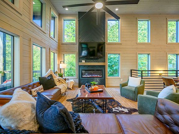 The cabin is fully equipped with chef's kitchen with high-end black stainless appliances, a large refrigerator, and ample cabinetry and cooking space. The living room features a 65" smart TV, two large leather sofas, a fireplace, and expansive windows that bathe the space with natural light. Enjoy outdoor amenities like a hot tub, kids playground, fire pit, outdoor patio with a fireplace and TV, BBQ grill, and outdoor dining. For entertainment, there's a pool table with ping pong, poker chips, arcade games and lots of other board games like giant Jenga, darts and Connect 4.