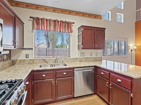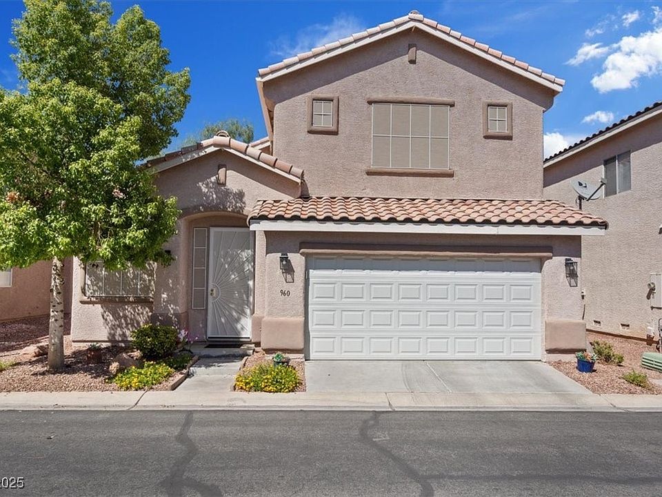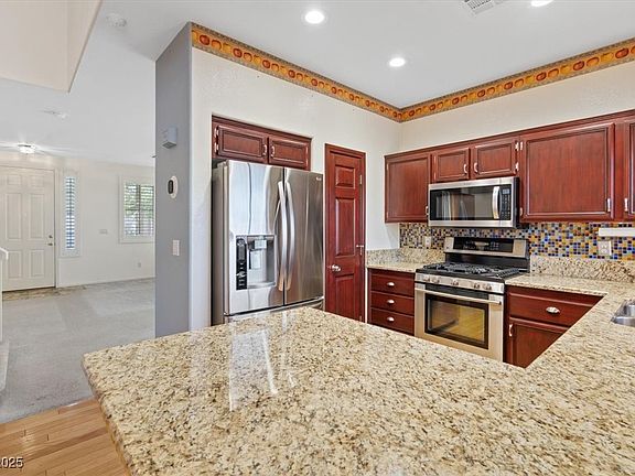 Charming 2 bedroom, 2 bathroom home in a desirable Las Vegas neighborhood. This thoughtfully designed floor plan features a bedroom and full bath downstairs, while the private primary suite is upstairs with a spacious walk-in closet and ensuite bathroom offering double sinks. The kitchen boasts granite countertops, stainless steel appliances, and a window over the sink for natural light. Enjoy the convenience of an attached 2-car garage and a comfortable layout perfect for everyday living.