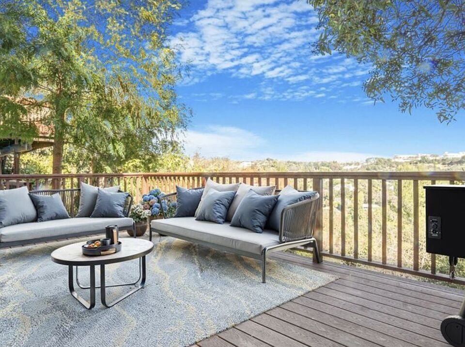Step into a spacious great room adorned with a stunning stone fireplace, stone flooring, and soaring pitched beamed wood ceilings enhanced by skylights and recessed lighting. Expansive windows and sliding glass doors seamlessly connect the indoor space to a large deck with a hot tub, where you can soak in breathtaking panoramic views of the Getty Museum. The kitchen boasts brand-new appliances, perfect for culinary enthusiasts. The primary suite offers direct deck access, ample closet space, and an elegantly designed bathroom, featuring floor-to-ceiling designer tile, a luxurious claw-foot tub, and a separate shower. Additional highlights include a skylight in the secondary bathroom and direct entry to a spacious two-car garage where the washer and dryer are located.