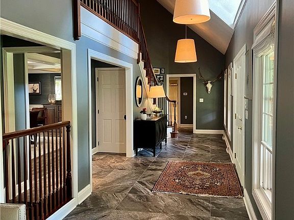 Inside the home is equally impressive, starting with a welcoming tiled foyer and a graceful, curved staircase. The main living area was thoughtfully opened to include a stunning, updated kitchen that flows into the dining area and a living room with vaulted ceilings and a cozy fireplace. The home features six fireplaces in total, adding warmth and character throughout.