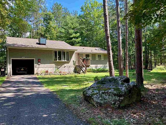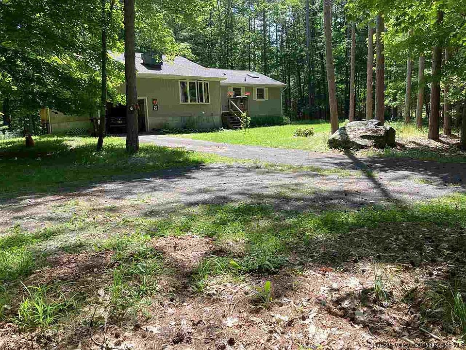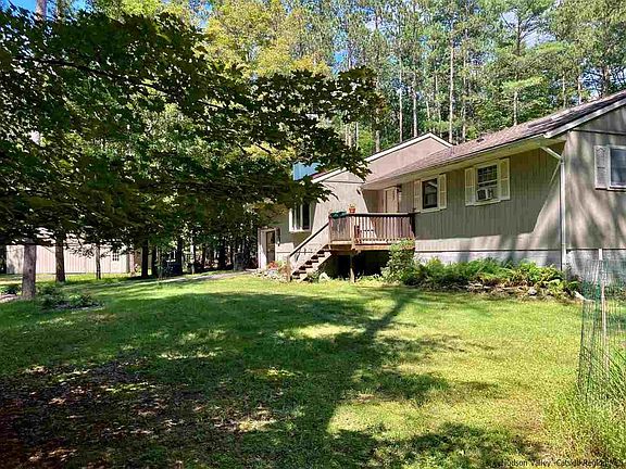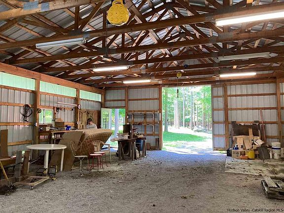 Solid 1980 ranch in lovely setting , and separate 1500 square ft. workshop/studio building with electric. The barn has high ceiling and erfect for big projects of all kinds. Back deck off the kitchen is totally private and looks out into the woods. . Open floor plan includes eating area living room and office/family room. This central area now freshly painted. Light for the basement is at right go Kitchen /garage door. Full dry cellar, and whole house has been improved with NYSERDA winterization for comfort and efficiency. Pull down access in garage to insulated attic