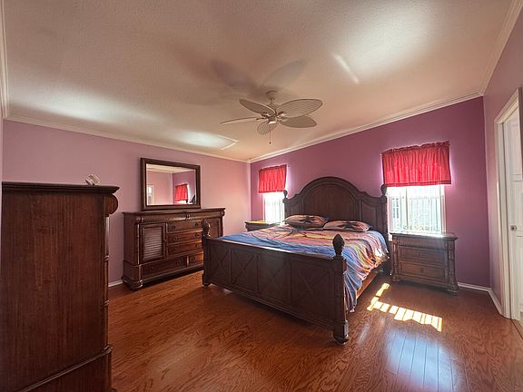 Palm Harbor has built a turnkey, move-in ready home that features a large carport and an extended 12 x 12 lanai leading to the side entrance. Upon entering, you'll notice the tile entry, textured walls, and bamboo flooring. The house boasts a spacious kitchen complete with a gourmet island, Corian countertops, stainless steel appliances, white soft-close cabinets, and recessed lighting. The generously sized living room includes built-in shelving and ample lighting, and there is a dedicated laundry room with access to the lanai. The first guest bedroom comfortably fits a queen-size bed and is conveniently located near a guest bathroom. The grand master suite easily accommodates a California King bed and features a large closet, an en-suite bathroom with a soaking tub, a small step-in shower, and two vanities-perfect for his and hers, or however you prefer. The home is enhanced by high ceilings and spacious room sizes, making it ideal for entertaining or relaxing. Additionally, there is a huge shed in the back for extra storage, along with a freestanding shed that includes a loft. If you are in search of a nicely furnished, move-in ready home, please call us to schedule an appointment or feel free to stop by!
