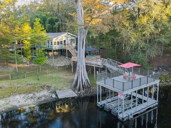 Looking for a great riverfront property on the Santa Fe with plenty of space to entertain indoors and out? Located in Three Rivers Estates with access to boat ramps and a rec area with $100 annual membership. The home is on one lot and you get an extra lot. It has a 50-amp electric box with a covered pavilion and a covered boat shelter. (Cannot build on this second lot) The home comes FURNISHED and features two stories: Upstairs are 3 bedrooms and a large living room, dining room, and kitchen with walls lined with tongue and grooved cedar and galvanized metal in ceilings. Master bedroom has a wood-burning fireplace and a big screen TV and two walk-in closets with its own exit to the balcony. Bath upstairs, has a washer and dryer. Also has a game room with an air hockey table. Exit to the deck that leads to the aluminum double-decker dock for boat parking at the bottom and lounging on the top deck. Downstairs, the finished basement is one large room, with two king beds, another washer and dryer and a bathroom: all heated and cooled with a minisplit. Entertain on the covered patio upstairs or downstairs. Includes a hot tub, seating area, rockers, a fire pit, tv, grills and a bar. Peaceful, quiet and scenic with wildlife and game most any day. Currently used a vacation rental with consistent bookings.