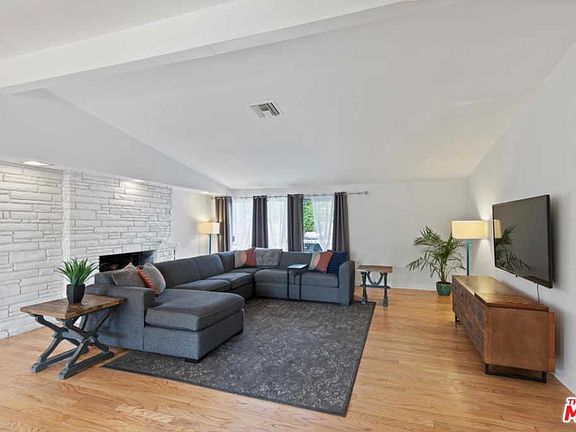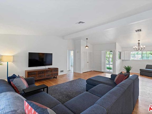 Standing tall on a sprawling corner lot of Devonshire Highlands, this private single-story mid-century modern home is just blocks away from shopping and restaurants! Details include soaring ceilings, 2 fireplaces, hardwood floors, wet bar, and built-in display shelves. Large windows face a beautifully landscaped front yard with access to the pool from almost every room in the back. The open chef's kitchen boasts quartz countertops, Talavera tile backsplash, stainless steel appliances including a Thermador 6-burner gas cooktop and double Thermador convection oven; custom cabinets with soft-close drawers and interior organization. This modernized home has a brand new roof, solar panels and drought-friendly landscaping. 5 bedrooms and 3 newly remodeled bathrooms are nestled in 2 wings: 2 bedrooms + 1 bathroom on one wing; master bedroom, 2 bedrooms + 2 bathrooms can be accessed on the south. Citrus trees sweep over private backyard with grassy area for true California living!