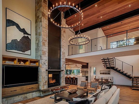 Inside this home are 4,655 square feet of elegance and detail while beyond are views that are infinite and inspiring. The great room is a work of modern art with a two-sided fireplace illuminating the dining room as well. The patio facing Lookout Mtn and the Tennis Pavilion has a hot tub, firepit, bbq bay and covered dining. A spacious island is at the center of the kitchen with the master bedroom and office close by. A handsome staircase leads to more bedrooms and media room of this 5-bed/5.5-bath home.
