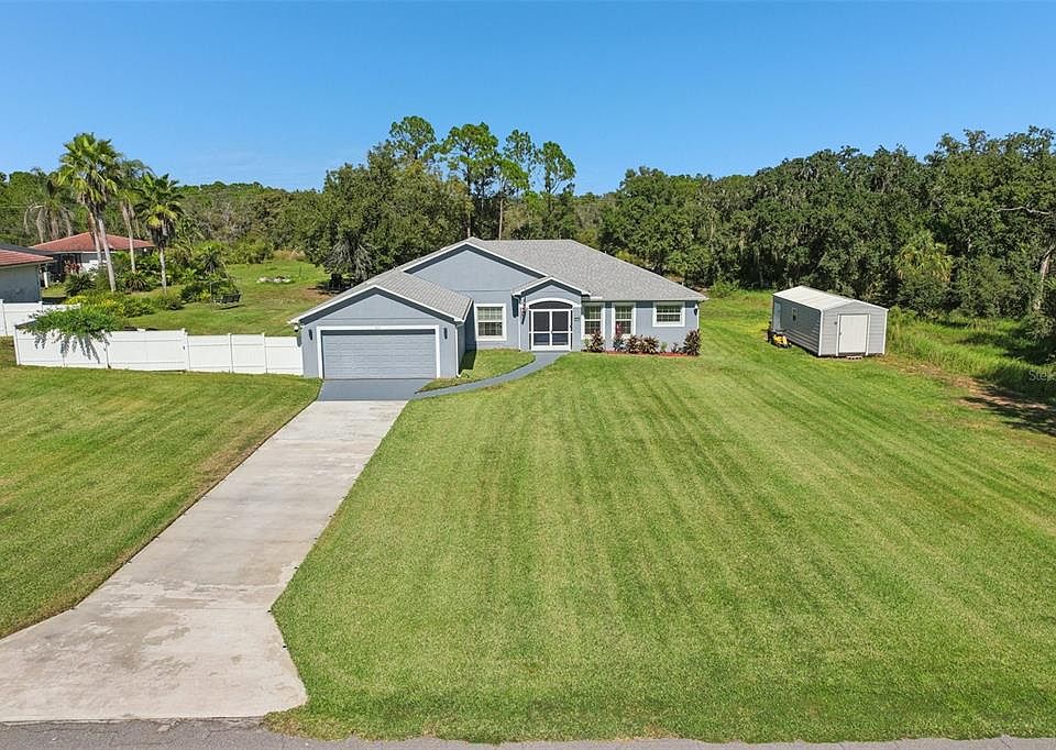 Welcome home to 9601 Oakwood Dr, a gorgeous 4-bedroom, 2 1/2-bath house built in 2022, sitting on a beautifully generous one-acre lot in the peaceful Walk-In-Water Lake Estates community. With approximately 2,298 sq ft of living space, you’ll enjoy roomy interiors, high ceilings (including tray ceilings in the primary suite, family, and dining rooms), and laminate flooring throughout for a fresh, easy-living feel. The kitchen features granite counters and a sleek gas stove, modern cabinetry, a breakfast bar, pendant and recessed lighting, a huge pantry, and a stylish tile backsplash. The primary suite delights with a double-shower layout, dual sinks, a vanity area, and plenty of storage. Stay safe with impact-/hurricane-resistant windows offering quiet comfort and peace of mind. Timeless French doors lead to the generous screen porch. Outside, kick back in the screened lanai (and screened front entry as a bonus) with serene natural foliage all around. Plenty of room for a pool! Or wander down for a sunset view at the community dock on the lake, or join in the fun at the Clubhouse. On the practical front, recent upgrades include a tankless water heater, water filtration/softener systems, an AC mini-split in the garage, guttering, upgraded ceiling fans/light fixtures, exterior electrical outlets, irrigation, and even a 12' × 25' storage shed. With the optional annual membership ($200), you gain access to the clubhouse, boat/fishing dock, playground, and rec park—ideal for relaxed living in a friendly neighborhood filled with respectful neighbors and natural surroundings. Come see how comfort, style, and ease meet in one place.
