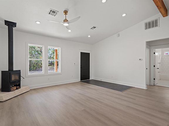 Discover this remodeled Oak Hill ranch on over an acre of private land. A metal roof and covered porch lead to an open-concept interior with a wood-burning stove, vaulted ceilings, and built-in shelves. The gourmet kitchen boasts a breakfast bar, gold hardware, new lighting, vent hood, and stainless steel appliances. Fresh paint and flooring enhance the guest bedrooms and stylish guest bath with tiled shower and storage. The primary suite features sconces, a luxurious bathroom with dual vanities, designer tile, and a large window overlooking the wooded yard. New vinyl windows ensure peace. A detached two-car garage offers a 240V hookup and separate panel for ample power. A serene, modern retreat awaits.