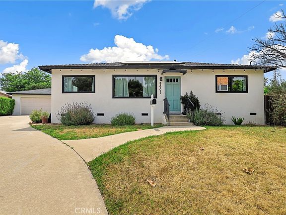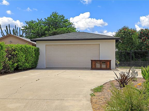 Welcome to this charming home featuring a fresh exterior with contrasting paint, trim colors, and an inviting aqua door. The spacious driveway leads to a beautifully updated interior with mid-toned laminate flooring throughout the kitchen, main living rooms, and bathroom, while the bedrooms remain carpeted. The living room off the entrance flows into the updated kitchen, which boasts a $19k remodel with quartz counters, white shaker cabinets, a utility sink, and a stylish subway tile backsplash. The kitchen opens into a spacious dining room with a new sliding glass door that leads to an outdoor patio with a ceiling fan and power outlet. The private backyard features mature bushes and a lemon tree, and the detached garage is accessible from the backyard. The home has solar panels installed, and all main house windows have been replaced for energy efficiency. Additional updates include a new mailbox and the removal of the old wall mail slot. The home offers three bedrooms, one situated off the living area and two others on the opposite side of the home with a full bathroom. Conveniently located near the 10 freeway, local schools, shopping centers, and dining options.