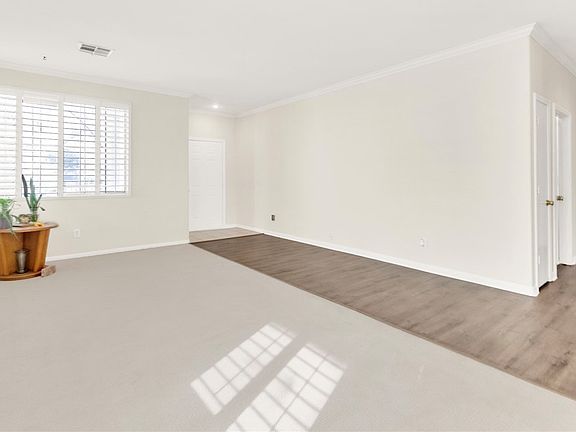 Step into comfort and charm with this beautifully maintained 3-bedroom, 2-bath home—move-in ready and full of thoughtful updates! A spacious living and dining room combo greets you with plantation shutters, crown molding, and new light fixtures throughout. The open-concept kitchen features updated cabinet knobs and a new faucet, flowing seamlessly into the family room—perfect for cooking, relaxing, or entertaining. Sliding glass doors open to a low-maintenance backyard with a covered patio, artificial turf, and desert landscaping. Inside, enjoy tile flooring in the kitchen and wood floors in the walkways. The primary suite offers mirrored wardrobe doors, dual sinks, and a walk-in shower. Whether you’re upsizing, downsizing, or simply seeking a move-in ready home in a quiet neighborhood—this gem checks all the boxes. No HOA!