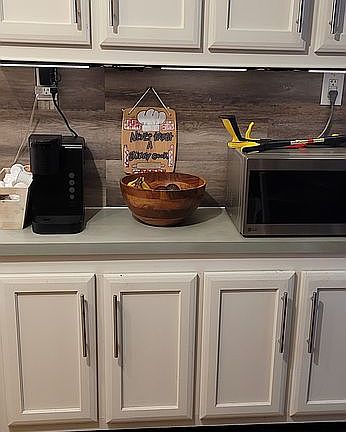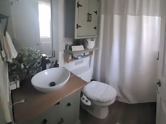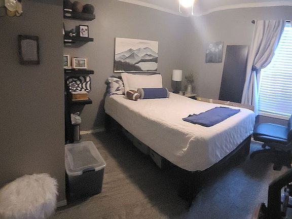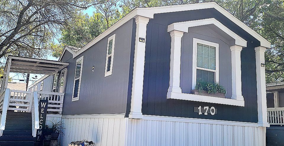 Open floorplan, new carpet, 2" faux wood blinds throughout, ceiling fans, upgraded all stainless steel appliances in kitchen, resurfaced kitchen countertops, updated 1 full bath, Murphy bed with built-in shelves, oversized tub in masterbath, udated finishes and crown molding throughout, lever door handles, separate utility room includes washer and dryer. Outside: large covered front porch, connected to porch 10' x12' deck, outbuilding with loft for storage, both custom built 2021 and more storage under front porch. 2 very large shade trees. Community pool and playground. Located in Camino Creek Mobile Home Comm.
