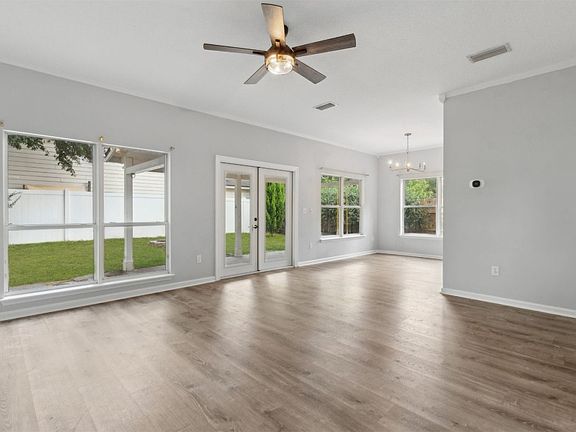 Welcome to this move-in ready gem, nestled on a desirable corner lot and just a short drive to the BEACH! Recent upgrades—including a 2022 ROOF and BRAND NEW AC—bring peace of mind for years to come, while the FRESH INTERIOR PAINT and striking flooring set the tone for modern living. Inside, the open floor plan is enhanced by upgraded light fixtures and ceiling fans, offering an airy and inviting atmosphere. The kitchen shines with granite countertops, newer stainless steel appliances, abundance of Espresso cabinetry, and generous counter space, blending style and functionality effortlessly. Both bathrooms mirror the kitchen’s upscale granite finishes for a cohesive design throughout. You'll love the large size of each bedroom, including the massive master suite with a walk-in closet and a nook area, ideal spot for a make-up vanity or reading nook! French doors open to a spacious, fenced backyard complete with an extended covered patio and cozy fire pit—perfect for outdoor gatherings and relaxing under the stars. This corner-lot property also offers walking access to the community playground, making it ideal for families. Schedule your private viewing today, before this move-in ready home is SOLD tomorrow!