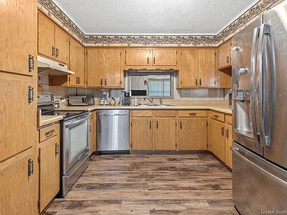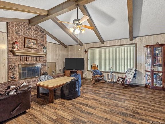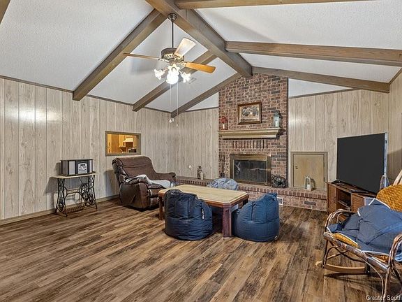 - Beamed Ceilings, Cathedral Ceiling(s), Formica Counters, Open Floorplan, Pantry, Shower in Tub, Eating Area In Dining Room