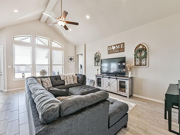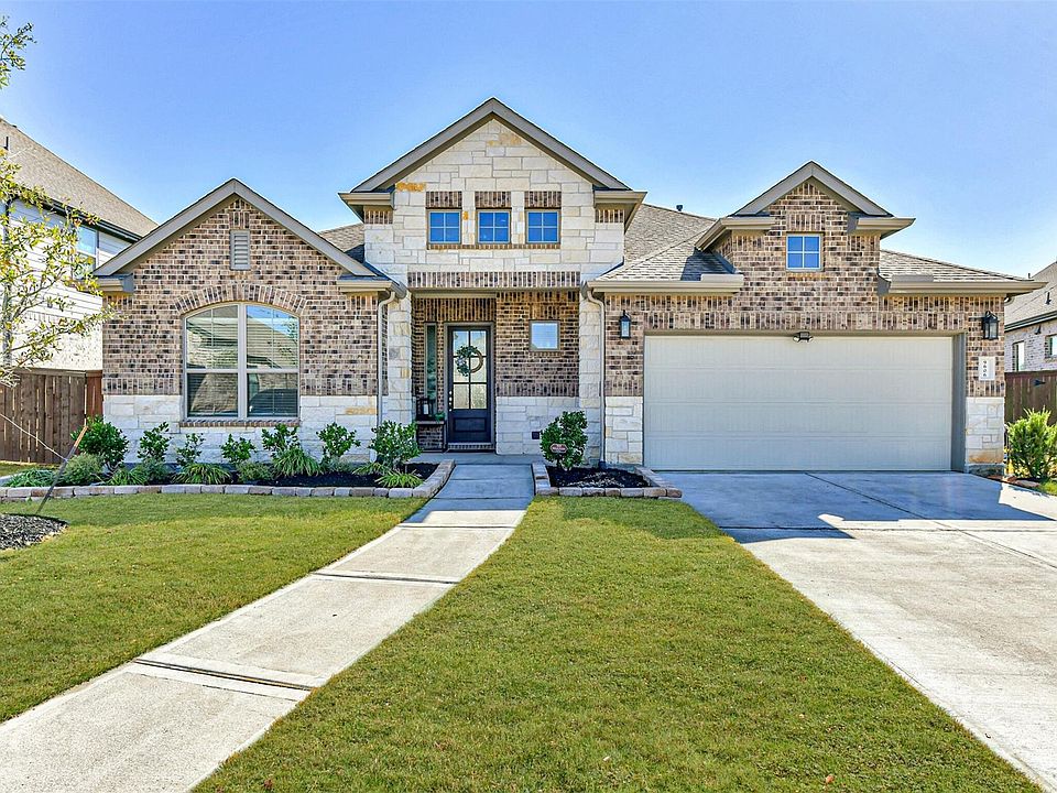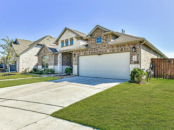 Tucked away on a quiet cul-de-sac in Meridiana with no backyard neighbors, this beautifully crafted Chesmar home offers the ease of recent construction without the wait. Built in 2021, the stunning brick-and-stone exterior and inviting front porch set a welcoming first impression. Inside, wood-look tile floors, tall doors, and soaring ceilings lead into a light-filled living room with a vaulted ceiling and expansive windows.