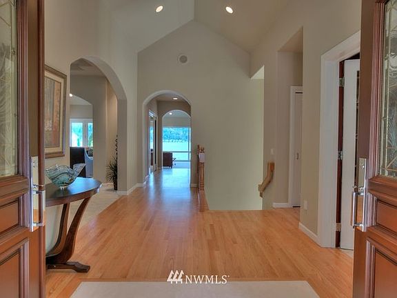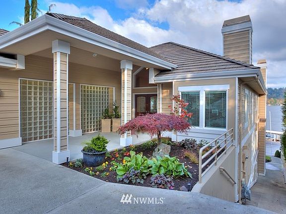 60’ +/-low bank waterfront w lg dock w/ 2 covered boat lift. Rm for 2 boats & yacht!View Mt. Rainier & lake views all around.Comfortable lifestyle for elegant/casual entertaining w/decks/patios all around.5 bedrm w/ 4 baths, family rm, extra kitchen, 4 gas fireplaces, wine cellar, den & much more.Elegant hardwd flrs & vaulted ceilings throughout most of top level.Optional master bedrm/guest suite on mn flr.Separate entry on lower level that could be a separate living area w/bedrm, kitchen, sauna