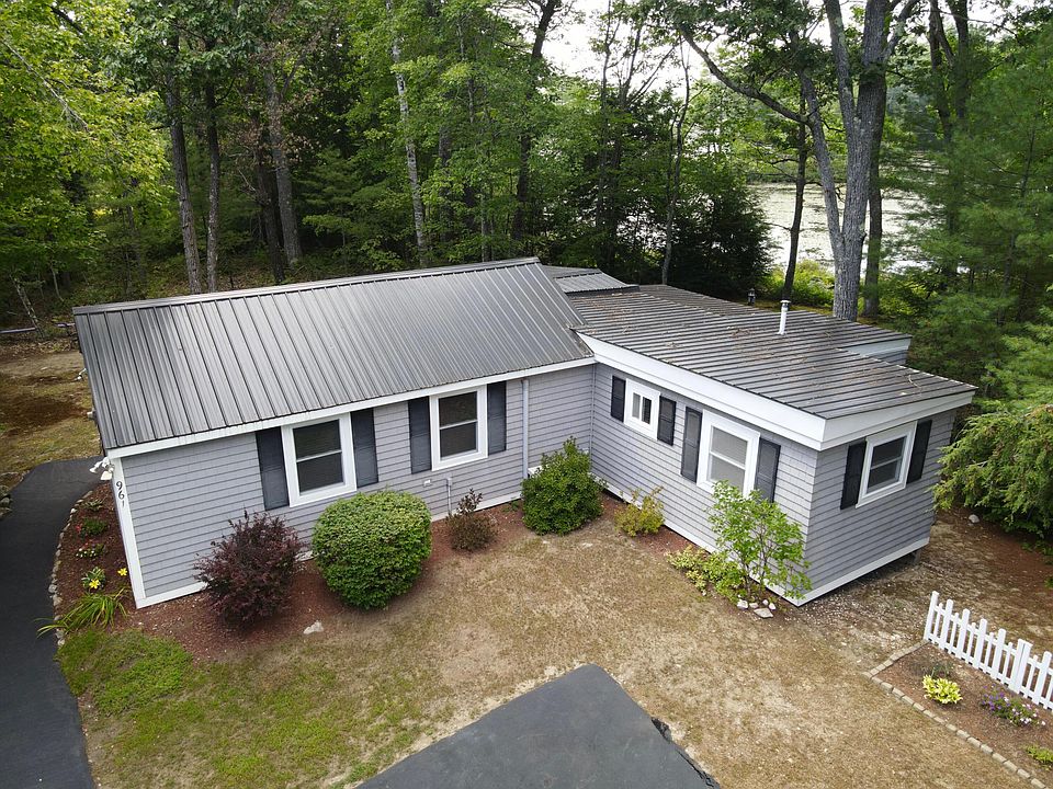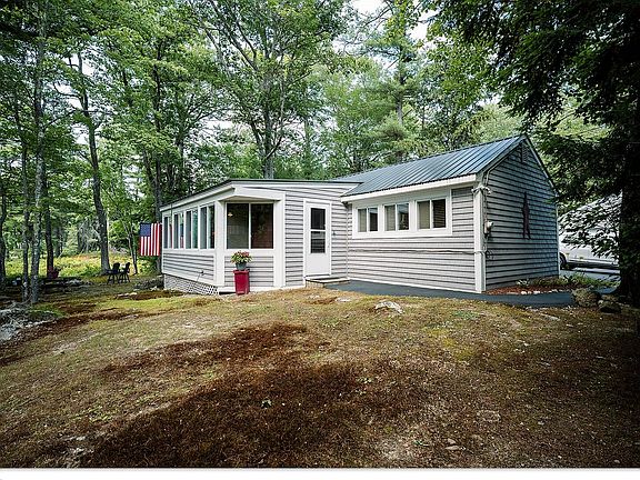 Charming ranch-style home offering a perfect blend of classic character and modern updates. Originally built in 1949, the 961sq ft residence has been completely remodeled and thoughtfully maintained over the years, providing comfortable living on a spacious .93-acre lot. The home features two bedrooms and one full bathroom, ideal for a family or a cozy retreat. Inside, a heat pump provides efficient heating and air conditioning, complemented by a propane heater for added warmth during colder months. A screened-in porch overlooks the cove of Moose Pond, offering a spot to relax and enjoy the natural surroundings. Outside, the paved driveway leads to a garage with space for two vehicles plus additional storage. The exterior has durable vinyl siding and a metal roof, enhancing curb appeal and longevity. The standout feature is the 275 feet of owned frontage, complete with a private dock—perfect for boating or fishing. Located near Pleasant Mountain ski area, this home is an excellent choice for outdoor enthusiasts. Being sold furnished, it offers a turnkey opportunity to enjoy lakeside living.
