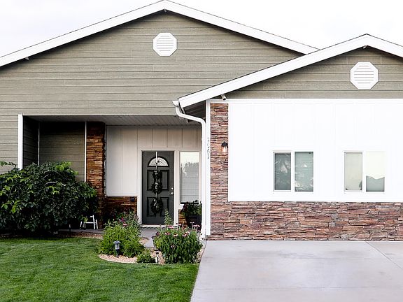 This home offers an open-concept living space with 9-foot ceilings, a split floor plan, and a garage converted into additional livable space. The modern kitchen features granite countertops, a gas range, and new appliances, including a refrigerator, microwave, and dishwasher. The master bedroom includes a stylish barn door and a bathroom with dual granite vanity counters. Wood plank laminate flooring flows through the main living areas and bedrooms, complemented by custom tile in the bathrooms and showers. Upgrades include a built-in bookshelf wall, a covered front entry, and a covered back deck. The oversized laundry room adds convenience, while upgraded lighting, a complete solar system for minimal electric bills, and a security system enhance the home's appeal.