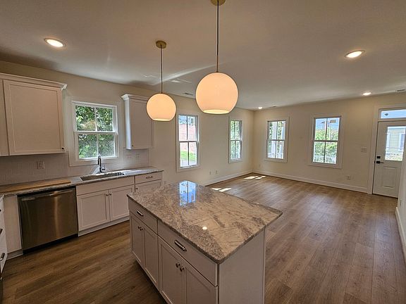 Stainless appliancesGranite countertopsTons of natural lightWhite custom kitchen cabinetryWood floors