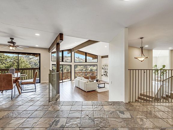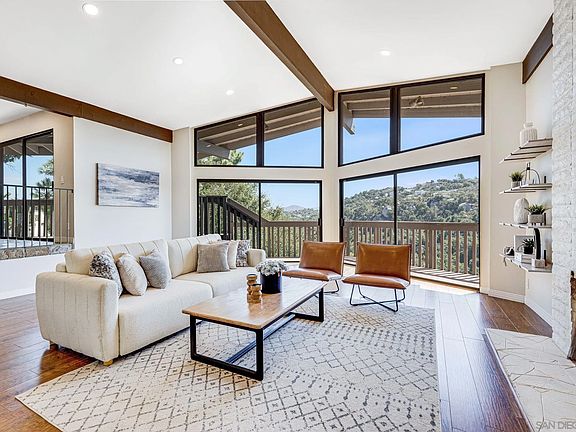 Discover this iconic mid-century modern home, featuring striking A-frame windows, nestled in the serene hills of Hidden Meadows with breathtaking views over Escondido, California, and a peek of the Pacific Ocean in the distance. Set on a quiet cul-de-sac, the welcoming entry through double doors leads you into the impressive foyer of this expansive 3,151-square-foot residence with potential to expand a large unfinished basement. Inside, you'll be captivated by the unique pitched roofline and floor-to-ceiling glass that frames stunning vistas of the rugged Escondido landscape. The thoughtful floor plan offers effortless living, highlighted by a spacious primary suite on the main floor, complete with an ultra-modern bathroom and a large walk-in closet. Enjoy the comfort of a newer HVAC system with a smart Nest thermostat. The updated kitchen boasts Carrera-style quartz countertops, elegant cabinetry, stainless steel appliances, and natural slate flooring. The elevated dining room seamlessly transitions to a wrap-around balcony that spans the entire back of the home, providing the perfect setting to savor magnificent sunsets and panoramic mountain views. Descend the wide staircase to discover generously sized bedrooms. Additional features include an oversized two-car garage with extra space for a golf cart or workshop/studio. The easy-care landscaping showcases drought-tolerant plants and an orange tree. A low HOA fee grants access to the Hidden Meadows pool, two lighted tennis courts, and an air-conditioned clubhouse. Conveniently located just minutes from I-15.