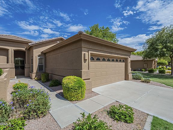 Welcome to this beautiful Villa in the gated 55+ community of Sun Lakes. This home offers 2 bedrooms, 2 baths, plus a versatile den that's perfect for an office, hobby space, or an extra guest room. Step into the kitchen and enjoy cooking with granite countertops and a gas range, then relax in the spacious living areas with tile and laminate flooring, and new carpet in the primary bedroom. Plantation shutters add charm throughout. The 2-car garage provides cabinets and a workspace for projects or extra storage. Out back, unwind under the covered patio with views of the HOA-maintained greenbelt. Residents enjoy exceptional community amenities—golf, pools, a fitness center, tennis and pickleball courts, a clubhouse, on-site dining, and endless activities. Come check it out today!