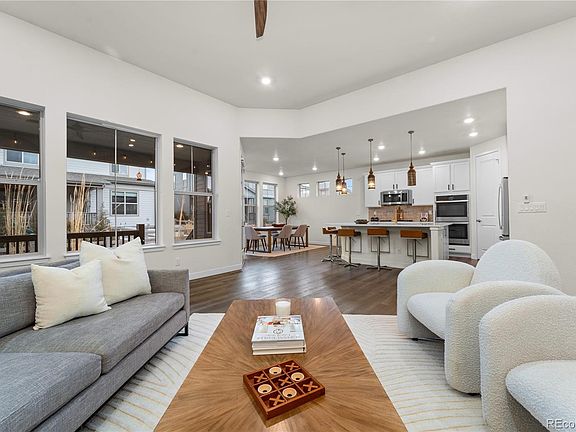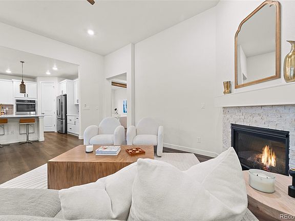 As you step inside, you'll be greeted by a grand foyer with soaring ceilings and beautiful natural light. The open concept living area is perfect for gatherings and features a cozy fireplace, perfect for chilly Colorado evenings. The thoughtfully designed office space near the entrance seamlessly coexists without taking away from your bedroom space, optimizing both functionality and visual appeal for those who work or school from home. The gourmet kitchen is a chef's dream, with plenty of counter space, modern appliances, and a walk-in pantry.