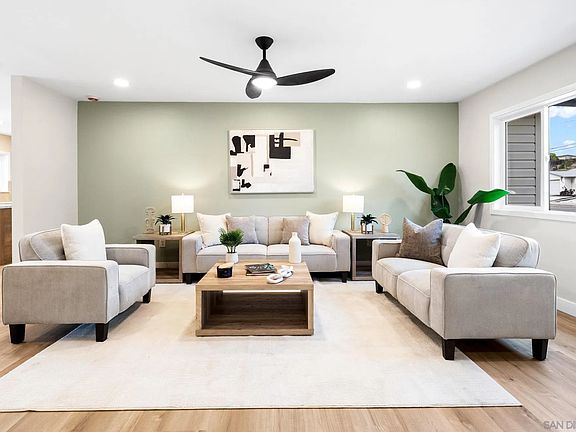 Welcome to 9616 Halberns Blvd—a beautifully renovated 3-bedroom, 2-bath home nestled in the heart of Santee. This stylish residence blends modern finishes with timeless comfort, featuring a bright open-concept layout, luxury vinyl plank flooring, and large windows that flood the space with natural light. The gourmet kitchen is a showstopper with sleek quartz countertops, custom cabinetry, stainless steel appliances, and a cozy breakfast bar—perfect for entertaining or everyday living. Both bathrooms are tastefully updated with designer tile, contemporary fixtures, and elegant gold accents. Step outside to your private backyard oasis complete with low-maintenance turf, serene canyon views, and a spacious patio area—ideal for relaxing or hosting summer BBQs. Additional highlights include a two-car garage, central A/C, and fully paid solar, offering energy efficiency and peace of mind. Centrally located near top-rated schools, shopping, dining, parks, and easy freeway access. This turn-key home checks all the boxes!