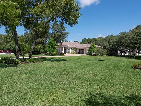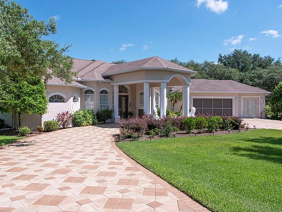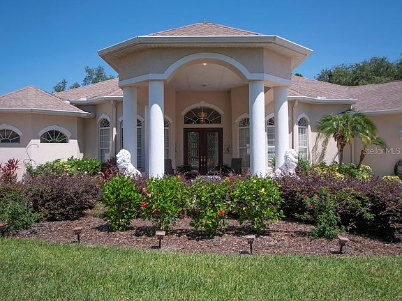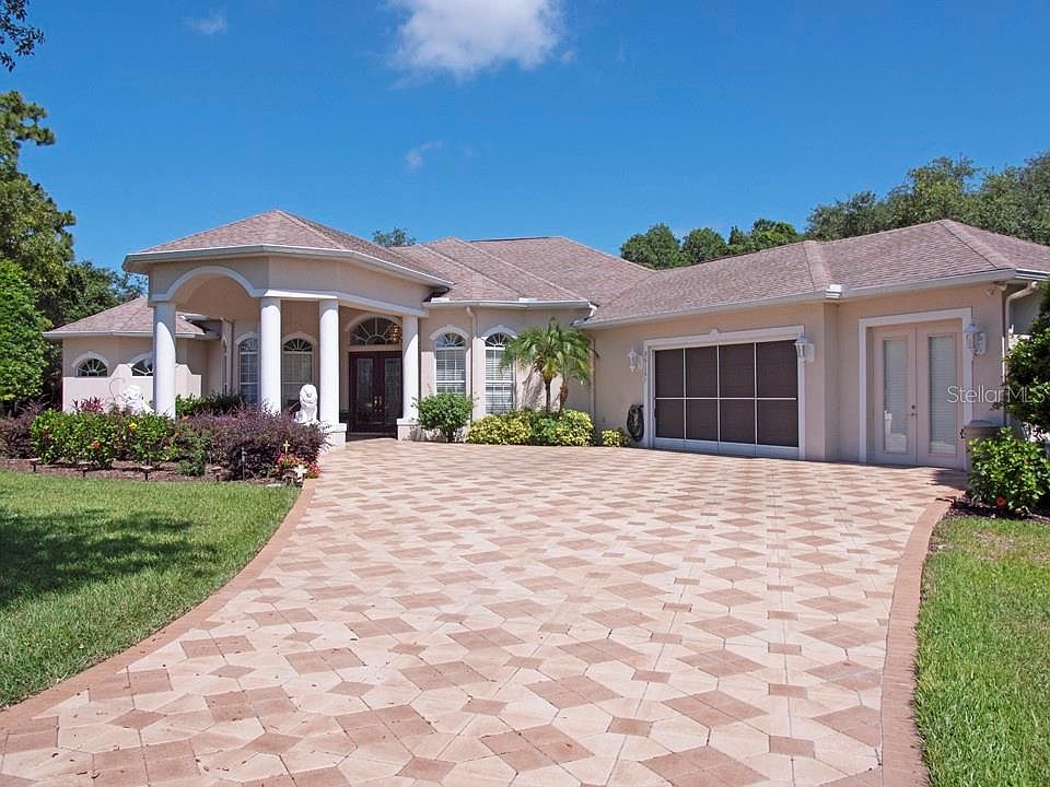 Located in Weeki Wachee, this stunning custom-built home is a fantastic example of luxurious Florida living. A circular paver driveway leads to a portico-covered main entrance, outfitted with gorgeous double doors and surrounded by well-established landscaping. No detail has been spared in the interior of the home, which showcases tall tray ceilings, crown molding, an open floor plan, tasteful light fixtures, and a variety of upgrades throughout. There's plenty of room in the spacious kitchen, which comes fully equipped with stainless appliances, Maple cabinetry, Corian countertops, an island, and breakfast bar. Overlooked by the kitchen, the formal living room is a beautiful space with lovely wood floors, chandelier, and double french doors leading out to the screened-in patio and private backyard. The home is highly accessible, with a main living suite that includes en-suite with walk-in shower. In addition to the many wonderful features, the residence also includes a guest suite with separate entrance off of the garage, which comes currently equipped with a half-bath that could be converted to a full bath for use as an in-law suite or AirBnB if desired. A fantastic property for those looking for easy-access to a variety of outdoor activities including kayaking, fishing, and canoeing, this residence offers a convenient location to Pine Island beach and Weeki Wachee Springs, plus a straight shot to Tampa, Clearwater, and Orlando. Some furniture available outside of contract.