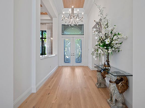 The outdoor living space transforms daily life into a resort style experience. The peaceful water views and lush tropical palms create a private resort inspired atmosphere with no rear neighbors. The covered patio and summer kitchen provide the perfect setting for alfresco dining, while the sparkling pool with sun shelf and gentle water features encourages relaxation and enjoyment of the South Florida lifestyle.