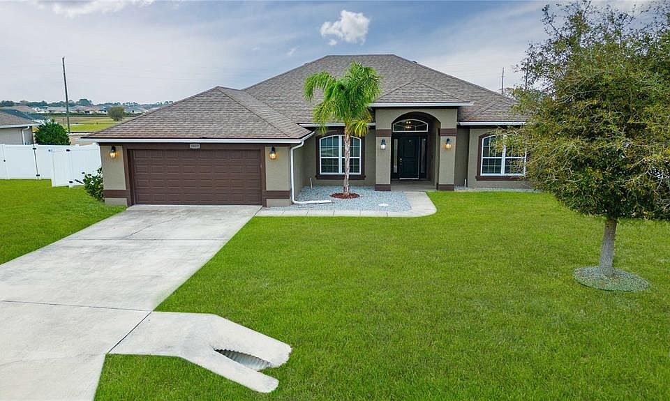 Discover comfort and style in this spacious 4 bedroom 2 bathroom beauty located in the heart of a serene gated community of Meadowglenn. This home offers an open and spacious split-bedroom floor plan. Walk into the beautifully tiled living room which features a custom shiplap TV wall that promises cozy evenings at home. The kitchen is equipped with granite countertops, stainless steel appliances, and a charming nook featuring custom bench seating perfect for morning coffees and casual dining. New carpeting in bedrooms and vinyl flooring in the master bedroom and one guest room. The den, enclosed with French doors, offers a quiet escape for work or study. Finally, step outside to your screened-in lanai and fully fenced backyard - a private oasis for soaking up the Florida sun! As a part of an HOA community, residents enjoy meticulously maintained surroundings within minutes from shops, restaurants, medical offices, and a brand-new Publix. Schedule your tour today! *Photos of backyard grass have been altered. Grass has been seeded with Bahia seed and should see improvement within the next few weeks.