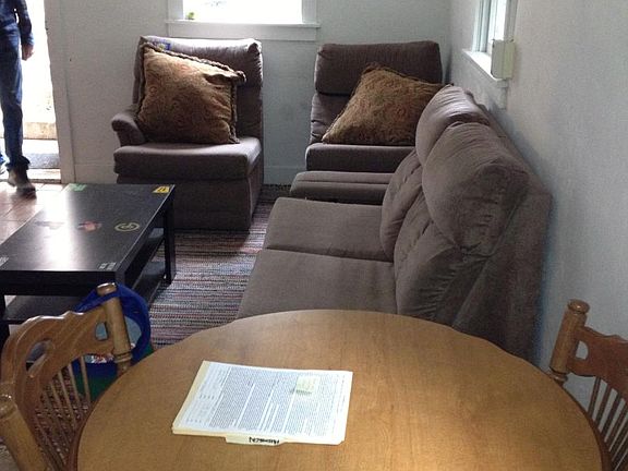 The unit is partially furnished with 2 small couches and kitchen table with 3 chairs.